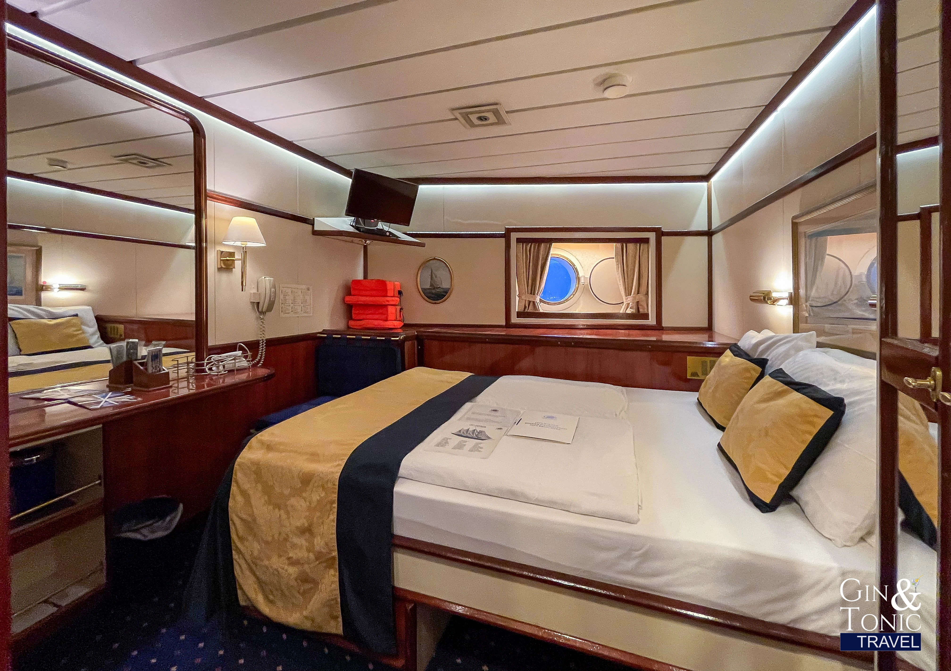 The accommodations are varied. Most cabins are on the lower decks and have one or two portholes. The beds are firm but comfortable. There is plenty of storage space and all cabins have a private bathroom with at least a shower. There are some cabins on the main deck of the ship, but there are no private balconies; passengers with these cabins access the sun deck directly.