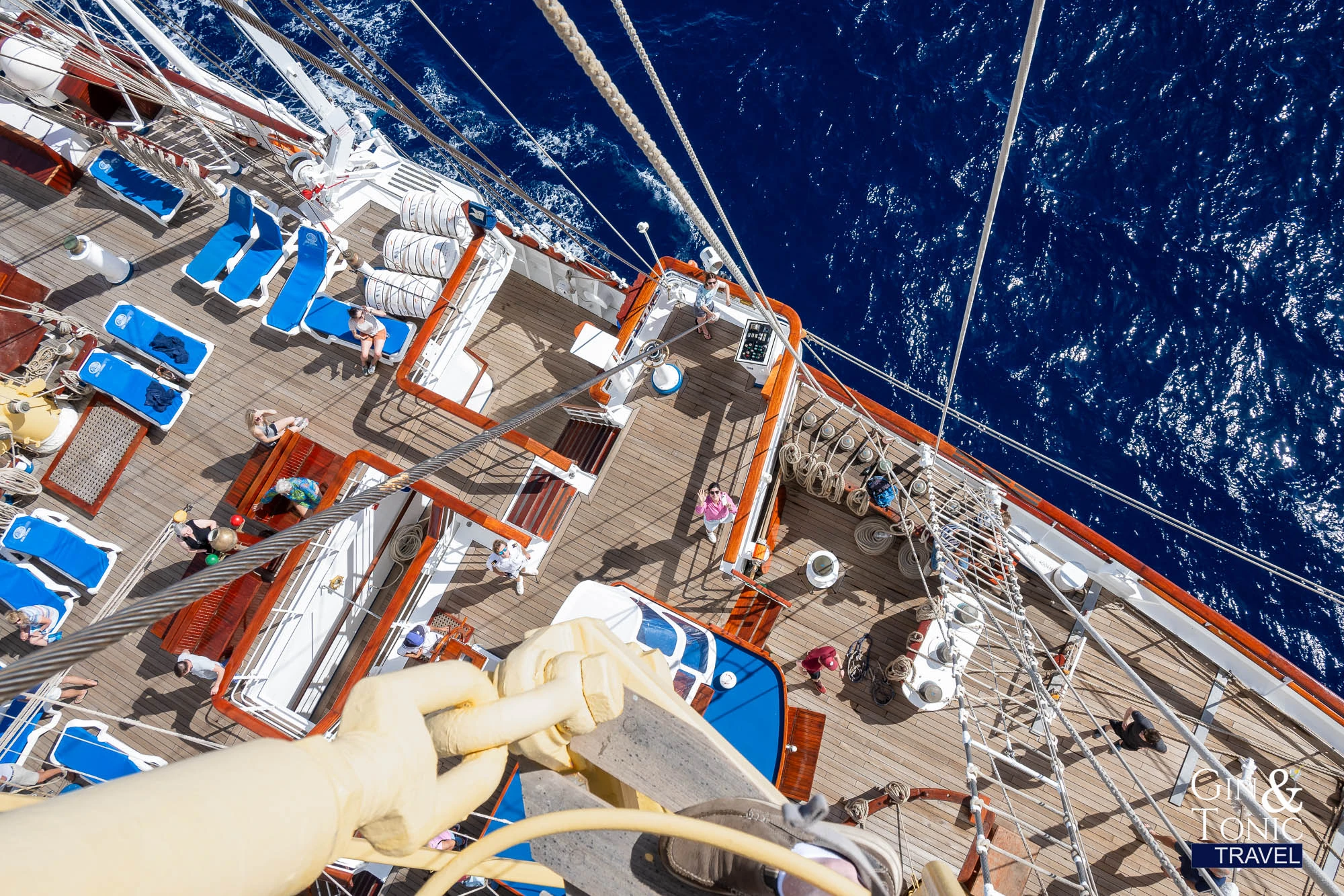 Life on board is relaxed yet enriching. Guests can partake in a variety of activities such as snorkeling, diving, paddleboarding, or simply lounging by one of two pools. There is a well stocked library with books in English, French and German. For those interested in learning more about sailing, there's an opportunity to join the crew in hoisting the sails, steering the ship or climbing the mast (below) for panoramic views of the ocean. Personally, we loved climbing the mast and relaxing on the bowsprit net. There is an open bridge policy, where you are welcome and even encouraged to interact with the ship's officers.